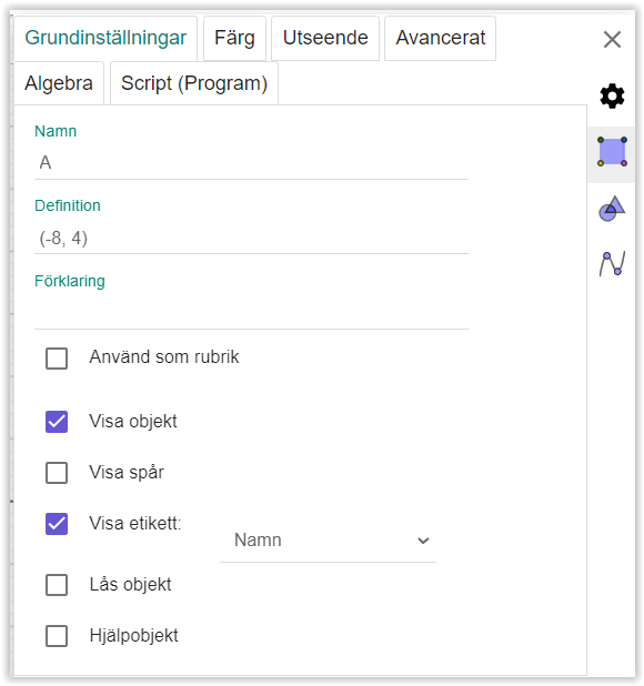 Den lilla blå kvadraten med markerade hörnpunkter indikerar att du är inne och ändrar ett specifikt objekts egenskaper. Vi ska titta på några få av alla egenskaper som finns att välja på. Beroende på objekt så varierar också egenskaperna som är tillgängliga. Alla har färg, utseende, script (dvs möjligheter att programmera objektet), grundinställningar (visa objekt och etikett till exempel) samt avancerade egenskaper. Tal har även egenskaper för glidare, punkter har en steglängd (när punkten flyttas med pil-tangenterna) och så vidare.