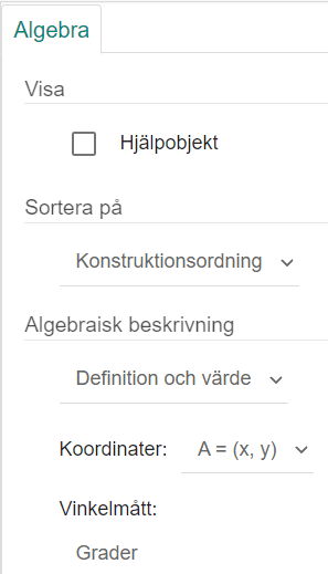 I algebrafönstret kan du ställa in sorteringsordningen på objekten. Som standard så sorteras de i konstruktionsordning vilket oftast är bra, men du kan också välja att sortera dem efter objektstyp så att alla glidare (tal), funktioner, punkter etc uppträder i samlade grupper. Du kan också välja att visa hjälpobjekt. Hjälpobjekt är normalt alla objekt i kalkylbladet samt alla objekt som du väljer att klassa som hjälpobjekt genom att markera den rutan i objektets avancerade egenskaper. Att klassa ett objekt som ett hjälpobjekt är ett enkelt sätt att dölja objektet och ”rensa upp” algebrafönstret i en komplicerad konstruktion.