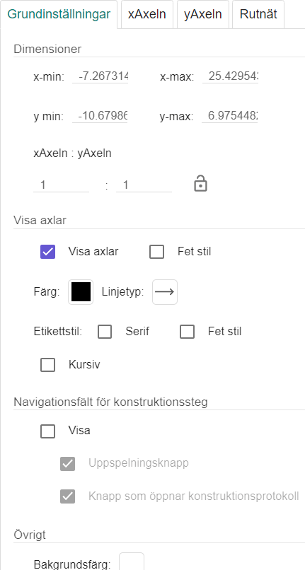 Punktstyrning: Under fliken Rutnät så kan du välja att låta punkter låsas till rutnätet. Det är bra om du vill låta eleverna skapa räta linjer som garanterat går genom punkter med heltalskoordinater.