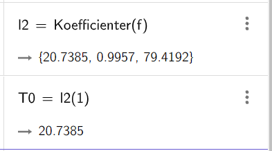 Om du ska räkna vidare med koefficienterna, som ofta är fallet i fysiklaborationer, så kan det vara bra att känna till kommandot Koefficienter(f). Det genererar en lista med de anpassade parametrarna till funktionen f som kan vara antingen en regressionsfunktion, ett polynom eller ett kägelsnitt. Observera att dessa inte är i bokstavsordning i listan. Vill du använda en särskild parameter kan du döpa den genom att skriva t.ex. T0 = l2(1) (det vill säga det första elementet i listan l2).