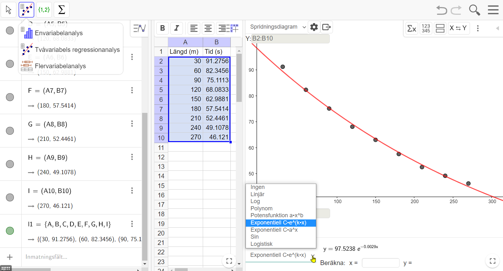 Skriv sedan kommandot Regression(l1, m). Om allt går väl har nu GeoGebra skapat en funktion till dina datapunkter i listan l1 av typen m.