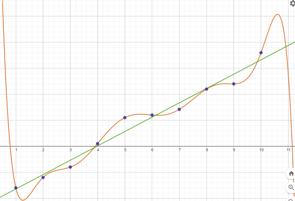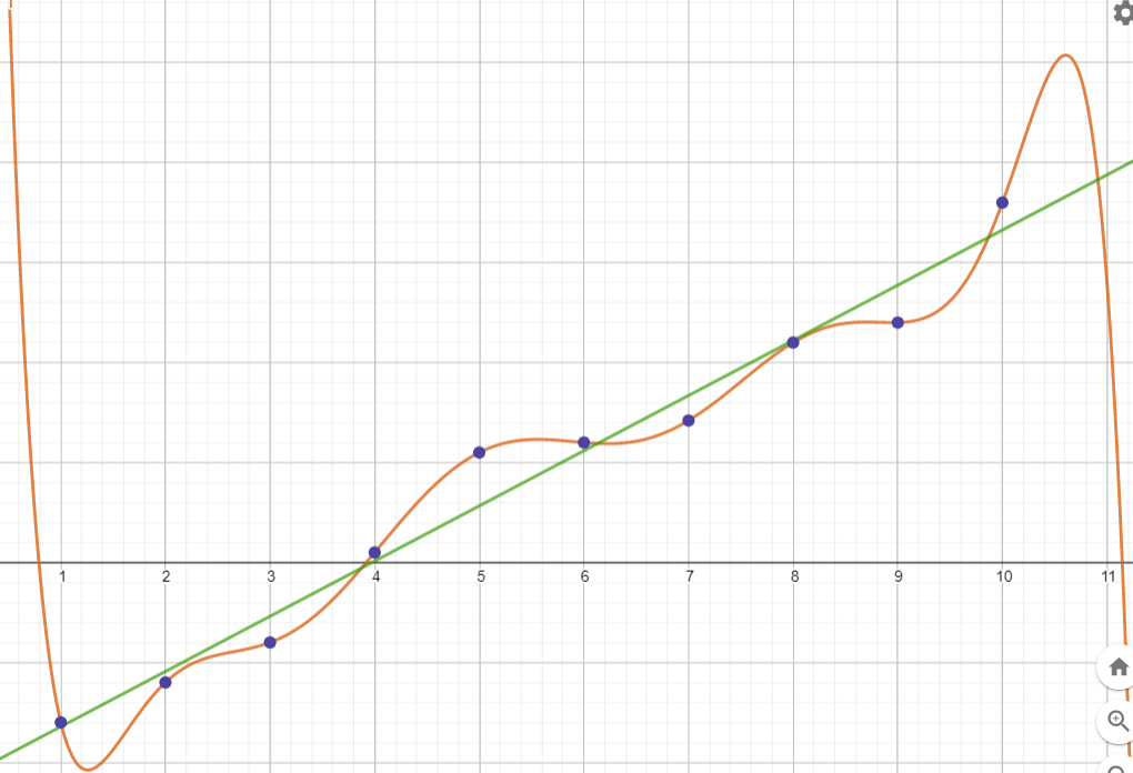 Den sista anmärkningen om ”i någon mening” är viktig. Det är bättre att använda en funktionstyp som stämmer med den underliggande teorin än att ta en godtycklig funktion som ”stämmer bäst”. Om det finns teoretiska skäl att en linjär funktion borde vara en bra funktion till dina 10 datapunkter så försök inte anpassa ett polynom av 9:e graden. Visst, det går perfekt genom alla dina datapunkter, men har ungefär noll prediktionsvärde eftersom det tenderar att svänga kraftigt och oförutsägbart.