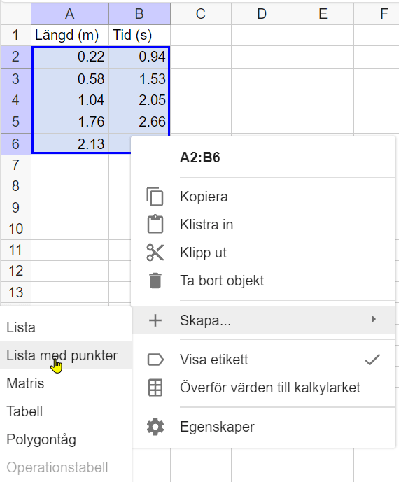 Eller så matar du in x– och y-koordinaterna i kalkylbladet. Du visar kalkylbladet antingen med kortkommandot Ctrl-Shift-S eller från Visa-menyn. Markera sedan alla numeriska värden (alltså inte eventuella rubriker), högerklicka och välj Skapa… -> Lista med punkter.