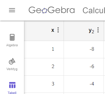 I onlineversionen av GeoGebra (= Calculator Suite) finns inget regelrätt kalkylblad, men där finns tabeller istället som fungerar på liknande sätt bortsett från att punkterna visas automatiskt. Du får dock använda Skapa lista för att få listan.