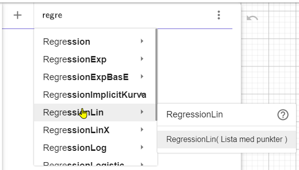 Du kommer åt alla dessa genom att skiva kommandon av typen RegressionLin(l1), RegressionExp(l1) eller RegressionPoly(l1, 3). I det sista exemplet skapas ett tredjegradspolynom. En lista på alla tillgängliga kommandon får du när du börjar skriva Regre….
