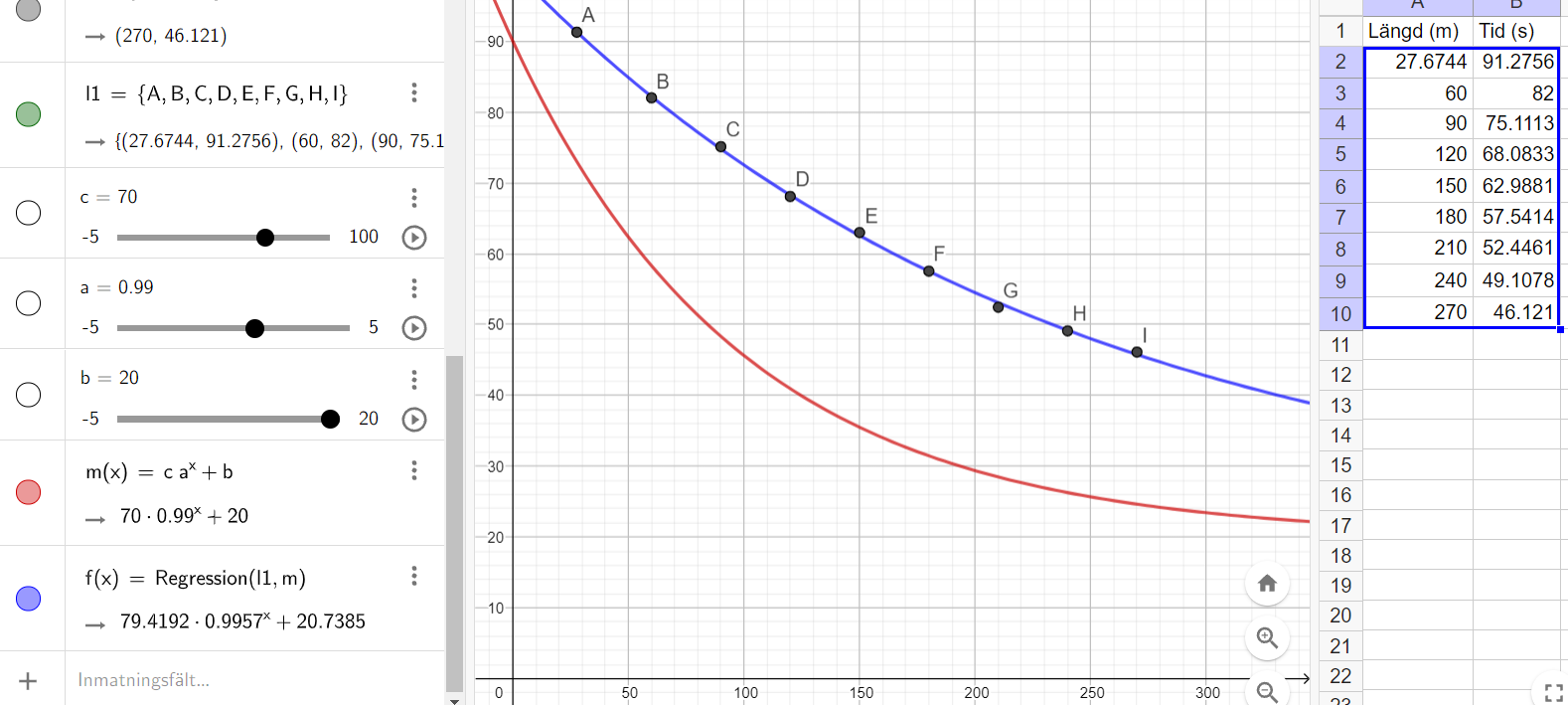 Definiera till exempel funktionen m(x) = c ax + b där a, b och c är oanvända bokstäver. Dessa kommer då att tolkas som glidare. I Classic 5 får du bekräfta detta i en popup-fönster. Du måste inte använda namnet m på funktionen men jag brukar göra det för att påminna mig om att det är min modellfunktion. m(x) ser troligen inte alls ut som något som passar dina datapunkter. Det är för att parametrarnas startvärden är långt ifrån rätt inställda. Vi ignorerar detta för tillfället och om du vill går det bra att dölja m(x). Den är bara till för att GeoGebra ska veta vad vi vill ha i nästa steg. Den här funktionstypen är för övrigt användbar då du undersöker avsvalning mot en rumstemperatur som är skild från noll.