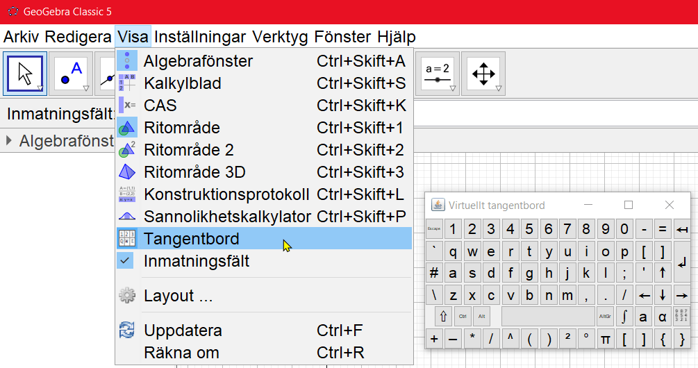 Du kan också få fram tecknet π genom att skriva ”pi”. x(A) plockar ut x-koordinaten av punkten A. Samma med y(A) för y-koordinaten. xAxeln och yAxeln är namnen på axlarna. Shift-Ctrl-C kopierar ritområdet till Urklipp. Klicka i ”ringarna” för att visa/dölja objekt.