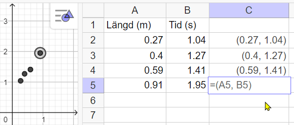 Du kan mata in x- och y-koordinater i två kolumner i kalkylbladet (Classicversionerna), markera dessa värden, högerklicka och välja Skapa… Lista med punkter så skapas punkterna och en lista med punkterna. Det här är användbart om du sen ska göra någon regression på dessa data.