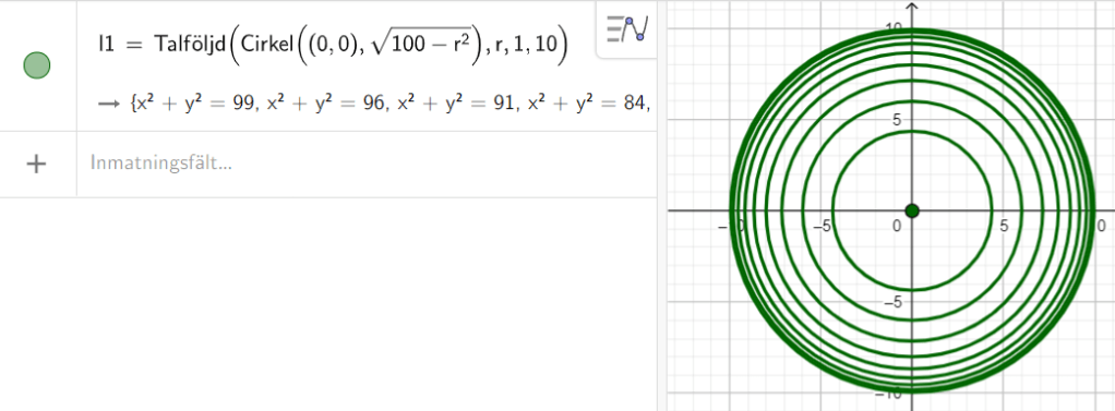 Ett av de kraftfullaste sätten att skapa listor är med kommandot talföljd. Låt inte lura dig av namnet på kommandot – det kan skapa listor av alla typer av objekt, inte bara tal. Du kan till exempel skapa en uppsättning koncentriska cirklar med kommandot Talföljd(Cirkel( (0,0), sqrt(100 – r^2)), r, 1, 10).