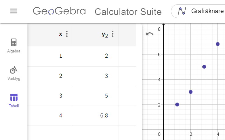Det finns dessutom en tabell där du kan mata in värden. Värdena i kolumnerna går att arbeta med som om de vore vanliga listor men listan som ser ut att heta bara ”x” heter egentligen x1 (skrivs x_1). Dessa listor kan du kan inte döpa om och de kan bara visas i tabellen om de först skapats där.