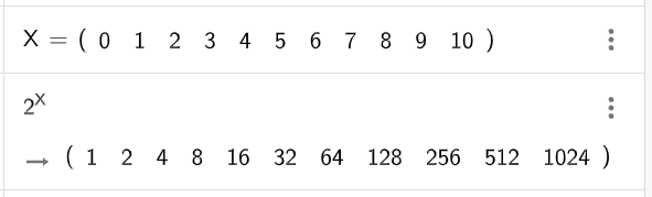 Om X = {0..10} så kommer 2^X att skapa en lista med tvåpotenser och X^2 att skapa en lista med kvadrater.