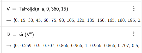 Om V = Talföljd(a, a, 0, 360, 15) så kommer sin(V°) att ge tabellvärden för sin (0°), sin(15°), sin(30°)… sin(360°). Det är dock kanske mer meningsfullt att göra detta i kalkylbladet.