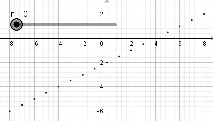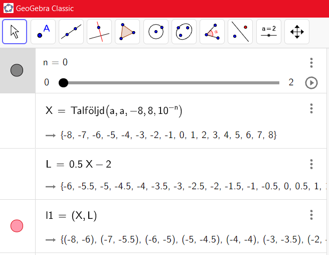 Om du i stället skapar n = 0 och X = Talföljd(a, a, -8, 8, 10^(-n)) kan du variera antalet punkter genom att variera värdet på glidaren n mellan ca 0 och 2.