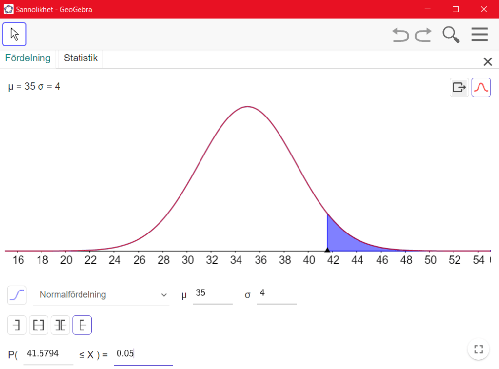 När vi har ensidigt öppna intervall som i det här exemplet så går det att ställa frågan åt andra hållet. Om du vill hitta den längd på fiskarna som bara 5 % av fiskarna är längre än, så matar du in 0.05 i den högra rutan. och hittar längden 41,6 cm.