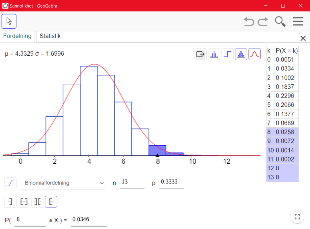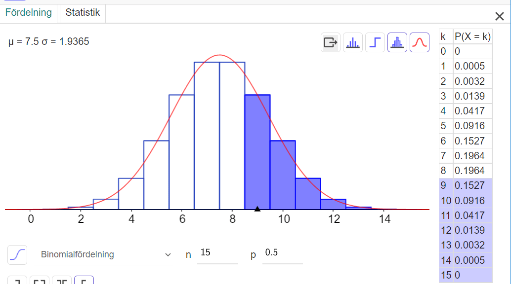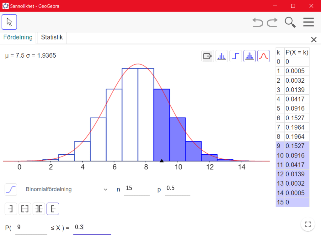 Nu gör vi tvärtom. Vi singlar slant 15 gånger. Det borde vara 50 % sannolikhet att få 8 ”kronor” eller mer. Hur mycket behöver vi begränsa det intervallet för att sannolikheten skall sjunka till 20 %? Mata in 0.3 i högra rutan så får vi svaret 9 ”kronor” eller fler. Mata in 9 på nytt i vänstra rutan för att dubbelkolla. Sannolikheten är 30,4 %, men för 10 ”kronor” är sannolikheten bara 15,1 %. GeoGebra avrundar till det nedre värdet på antalet kronor.