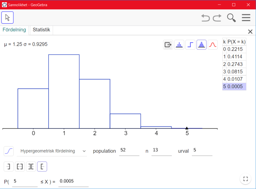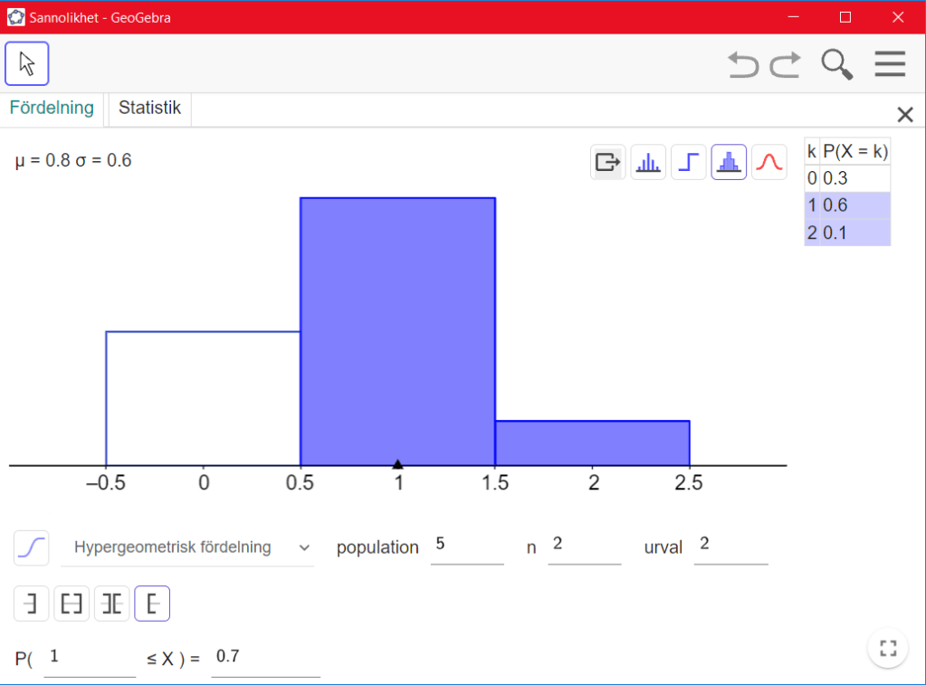 GeoGebras sannolikhetskalkylator är perfekt för att beräkna sannolikheter för till exempel normalfördelat material samt binomialfördelat (singla slant, tippa, dra kulor med återläggning) och hypergeometriskt fördelat material (dra kulor/kort utan återläggning).