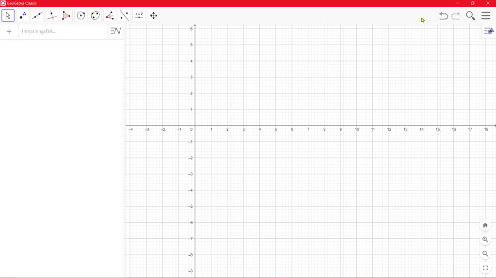 Vill du att att GeoGebra ska starta i full skärm eller i ett lite mindre fönster? Dra i hörnen tills du får den storlek du vill ha men om du ofta presenterar kanske full skärm är att föredra.