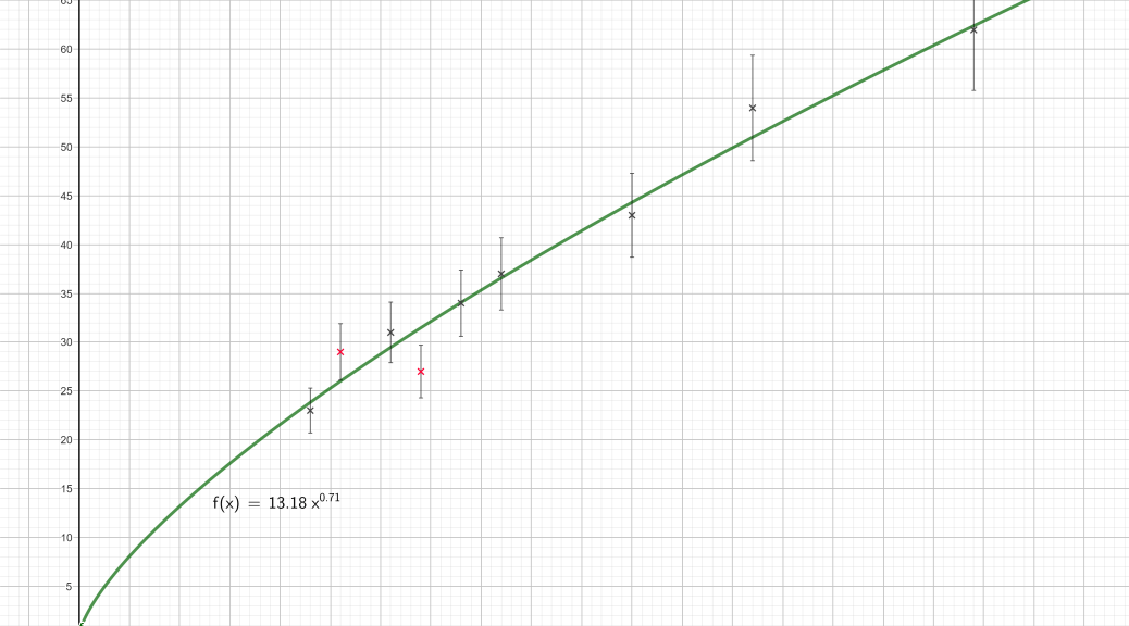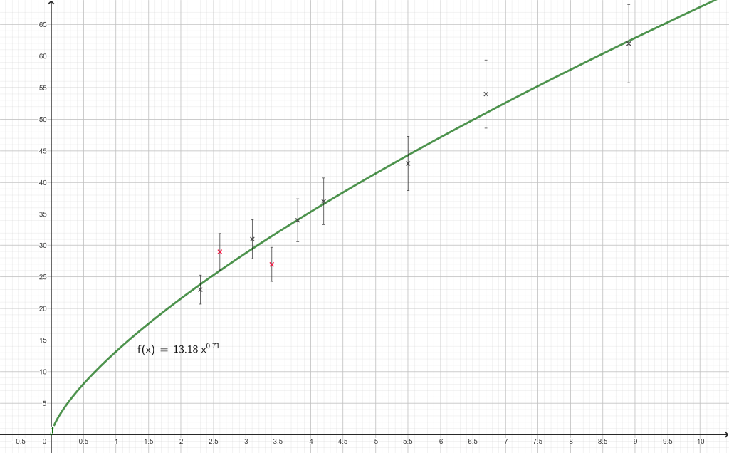 Om det är lämpligt kompletterar du med en passande regressionsfunktion, t.ex. RegressionPotens(D2:D10). Du kan dra funktionen från algebrafönstret till ritområdet för att skapa en textetikett.
