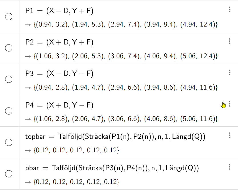 topbar = Talföljd(Sträcka(P1(n), P2(n)), n, 1, Längd(P)) bbar = Talföljd(Sträcka(P3(n), P3(n)), n, 1, Längd(P))