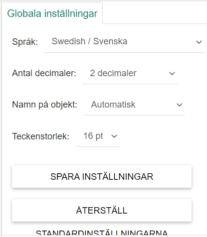 Det här bör du även visa eleverna så att de själva kan göra de inställningar som fungerar för dem i deras dagliga användning av GeoGebra och så att de förstår skillnaden mellan ”deras” GeoGebra och ”din” GeoGebra. En sak de kanske vill göra är att byta språk.