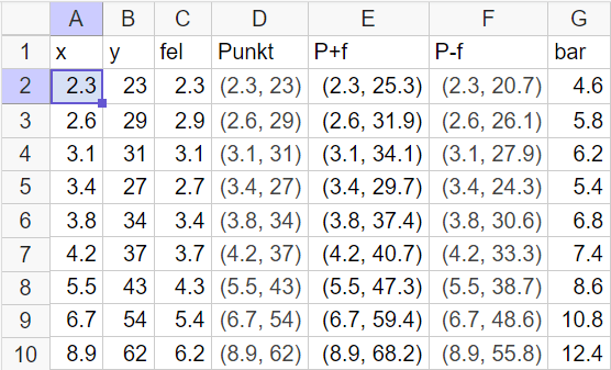 Det sista konstruktionselementet är själva felstapeln. I G2 skriver du =Sträcka(E2, F2) och kopierar ned formeln.