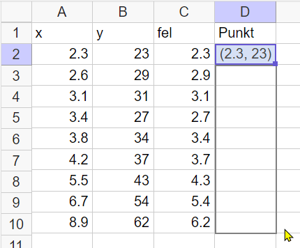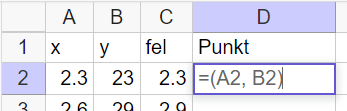 Det finns flera olika sätt att skapa själva datapunkterna. Den här gången gör jag det genom att i cell D2 skriva =(A2, B2). Likhetstecknet som inleder formler i kalkylprogram är frivilligt i GeoGebra. Du kan nu kopiera ned formeln genom att markera cell D2 och dra i den lilla fyrkanten i nedre högra hörnet. Då skapas de andra punkterna.