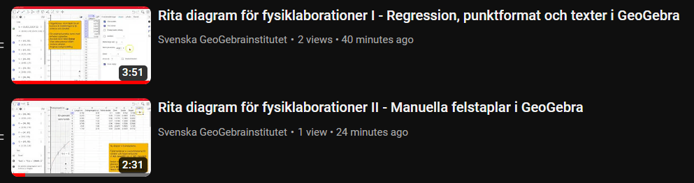 Den tredje och fjärde filmen handlar om hur du skapar snygga diagram till din fysiklabbrapport. Film tre tar upp inställningar för axlar, rutnät och punkter medan film fyra tar upp hur du skapar manuella felstaplar. En något äldre film om att skapa diagram finns också, som även tar upp beräkningar.