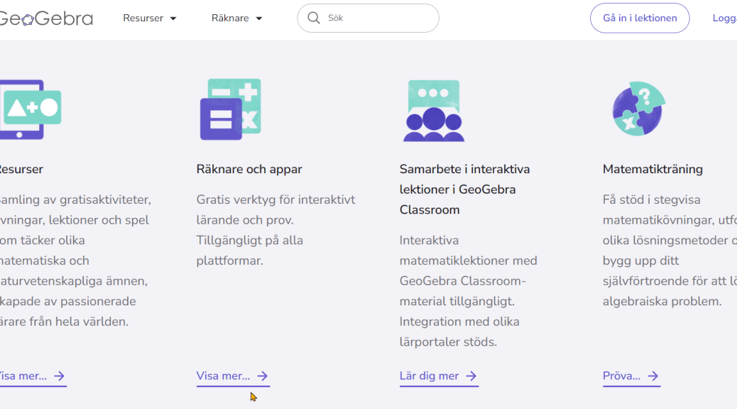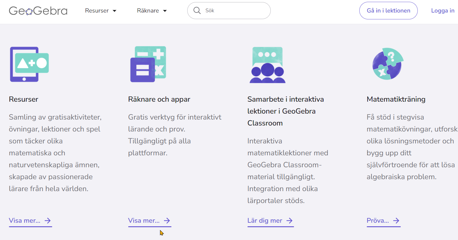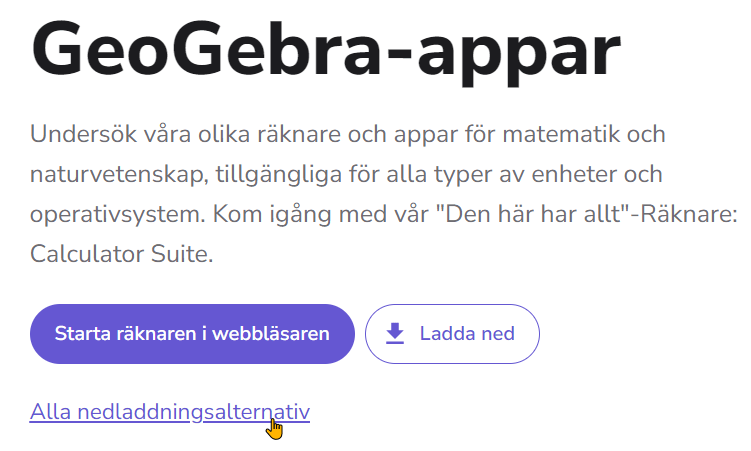 Om du vill ladda ned Classic 6 till datorn och befinner dig på geogebra.org så scrollar du ned en liten bit och klickar på Räknare och Appar (Visa mer…).