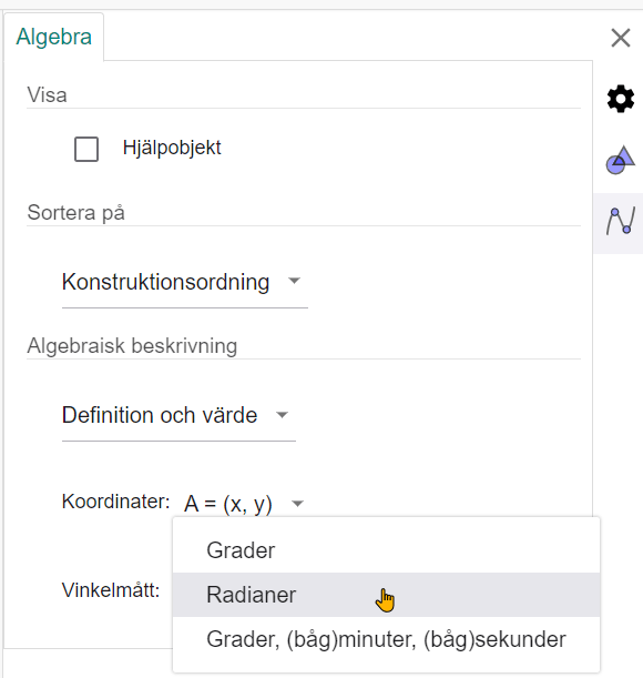 I grund och botten jobbar alltid GeoGebra med radianer internt. Men de flesta användare vet inte (ännu) vad radianer är för något så det måste finnas en mekanism för att omvandla grader till radianer.