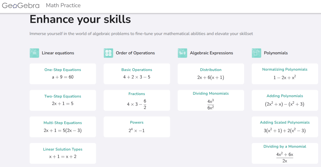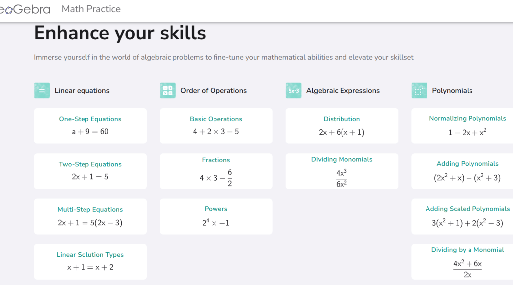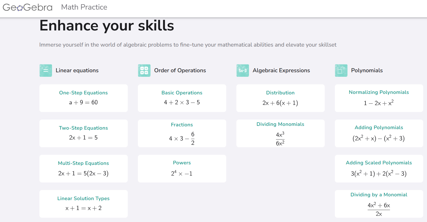 På sidan med den snarlika adressen https://geogebra.org/mathpractice kan dina elever träna grundläggande algebra på ett intuitivt sätt. Det finns många olika kategorier att träna på och du kan mata in helt egna uttryck också.