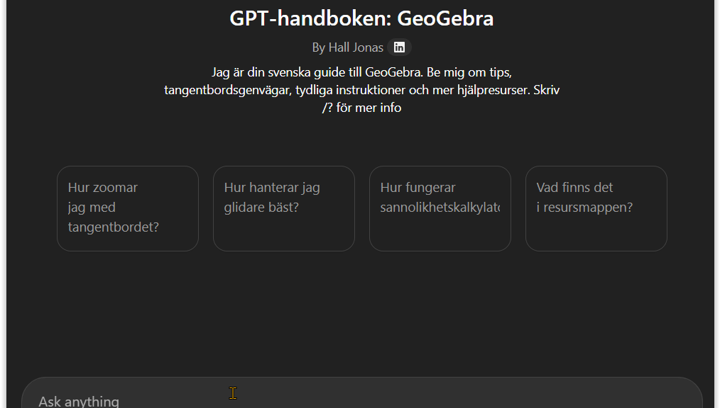 Det rör sig om en så kallad ”custom GPT”, en förpromptad version av OpenAI:s ChatGPT som har laddats med information om svenska namn på funktioner med mera. Du hittar den på http://geog.se/gpt eller http://gpthb.se/geogebra.