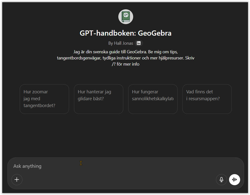 Jag tror faktiskt vi kan vara först i världen med att kunna erbjuda en AI-assistent som är specifikt tränad på GeoGebra och dessutom för svenska användare.