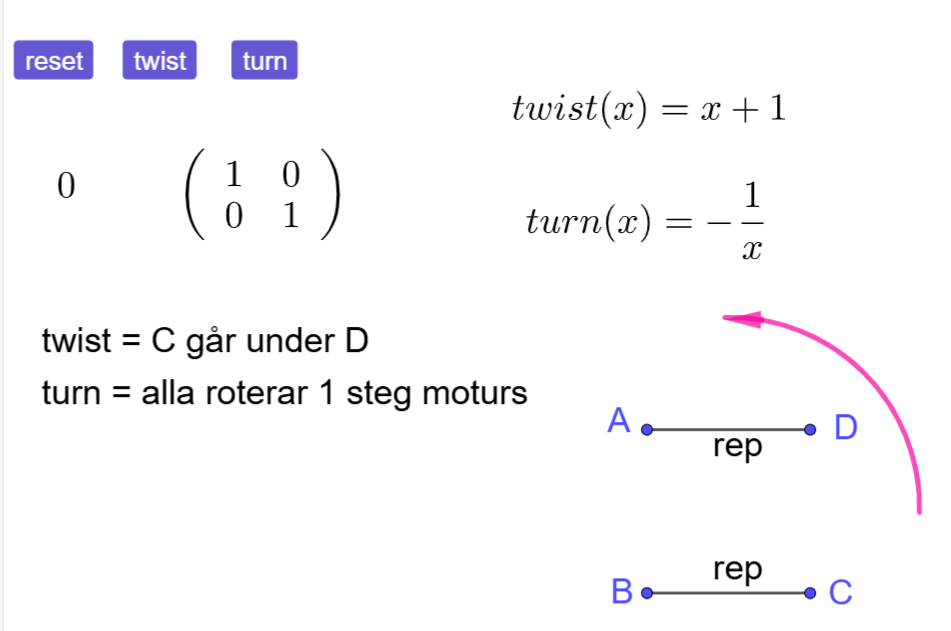 Om vi börjar med magin: Hur kan du trassla loss en rephärva genom att räkna med inverterade värden? Fyra personer står i en kvadrat med hörnen A, B, C och D. De håller i varsin repända två och två. Operationen Turn låter alla rotera ett kvarts varv motsols och operationen Twist låter två personer byta plats ( de som står vid position C och D). Genom att hålla koll på de matematiska motsvarigheterna till operationerna kan varje trasselhärva ges ett värde – och genom att invertera och lägga till 1 upprepade gånger kan du systematiskt – och nästan som med magi – trassla loss härvan igen. Se konstruktionen Tangles på GeoGebra.org.